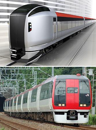 来年秋以降導入される成田エクスプレスの新型車両のイメージ(写真上)と、現在の成田エクスプレス。揺れ防止装置で乗り心地の向上を図ったほか、荷物置き場に鍵を設置するなどして快適性や防犯性をアップさせる